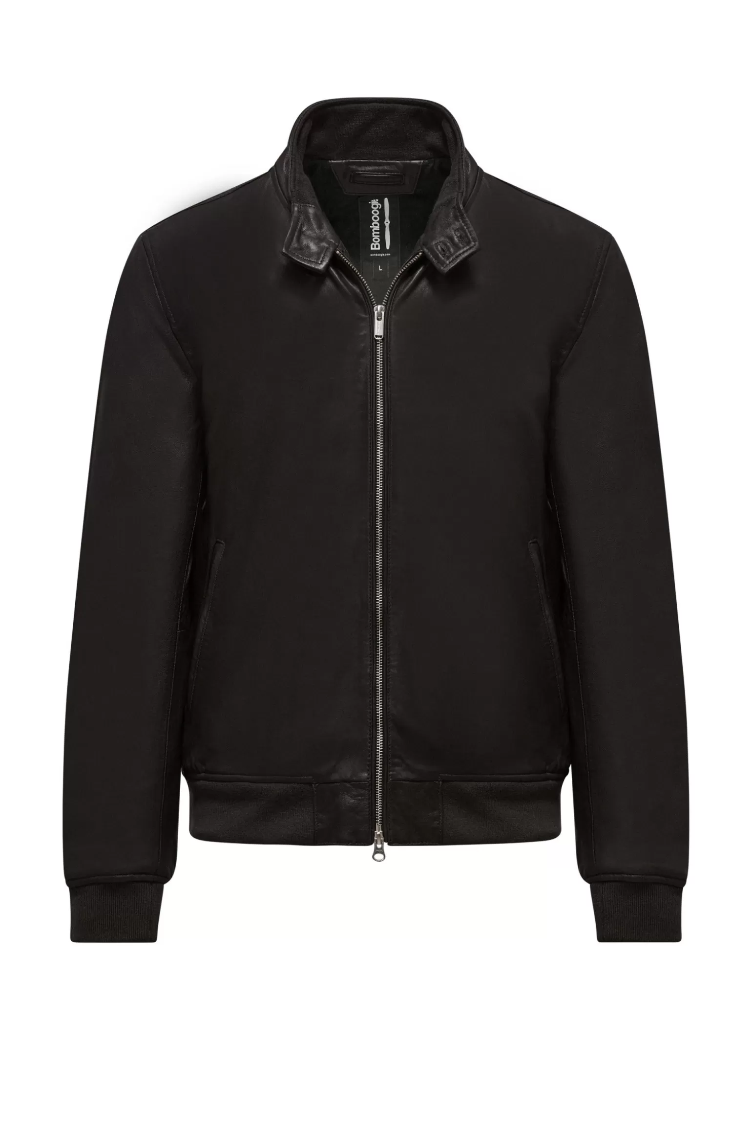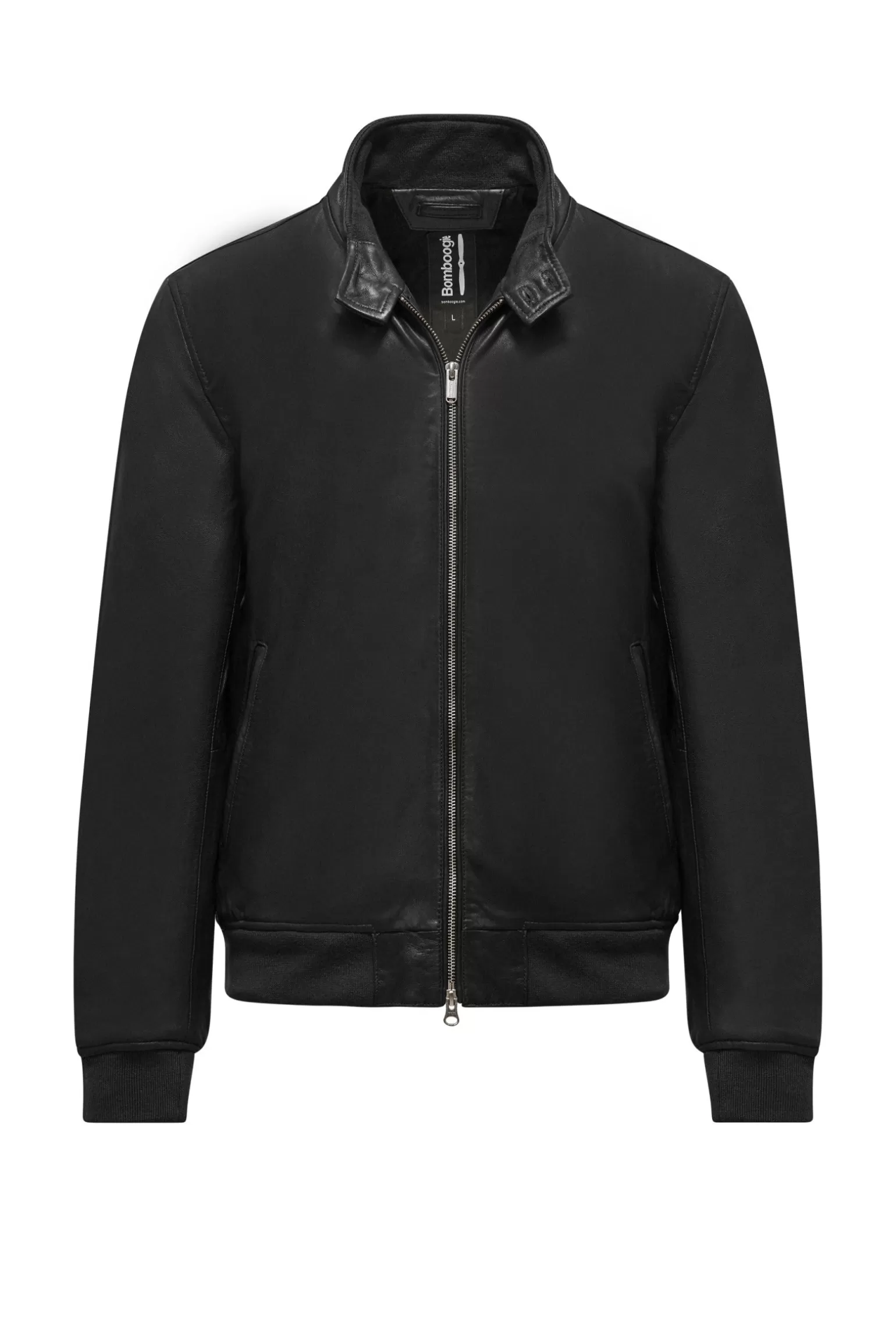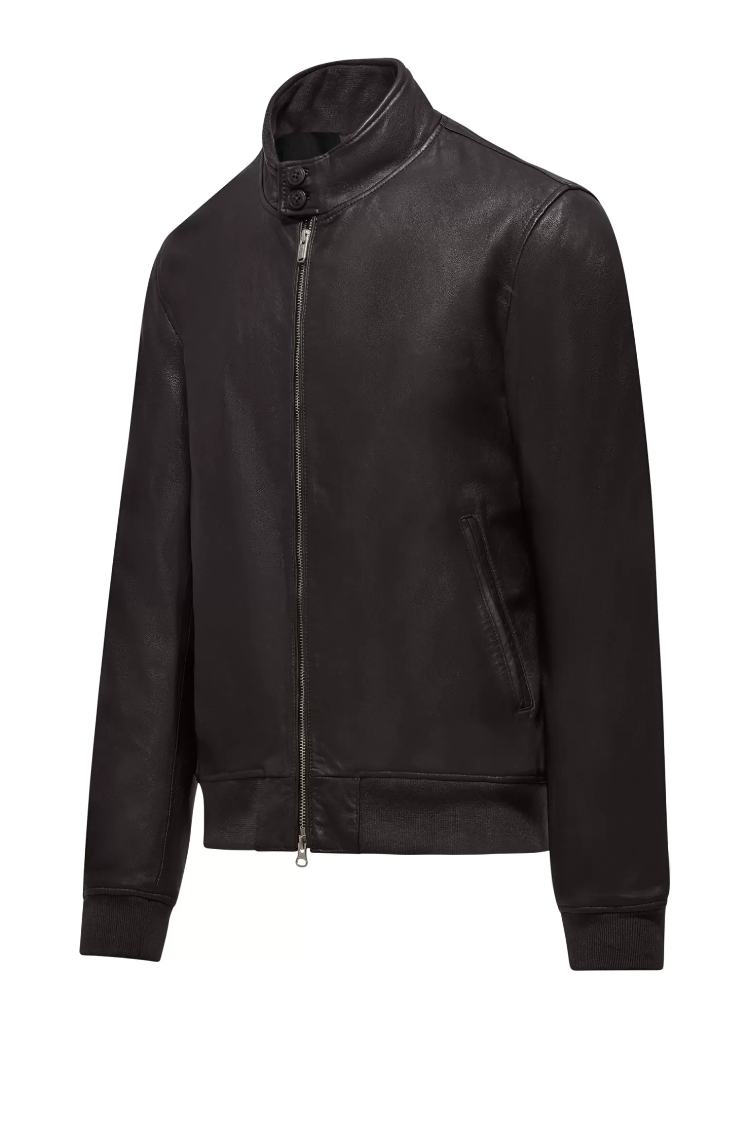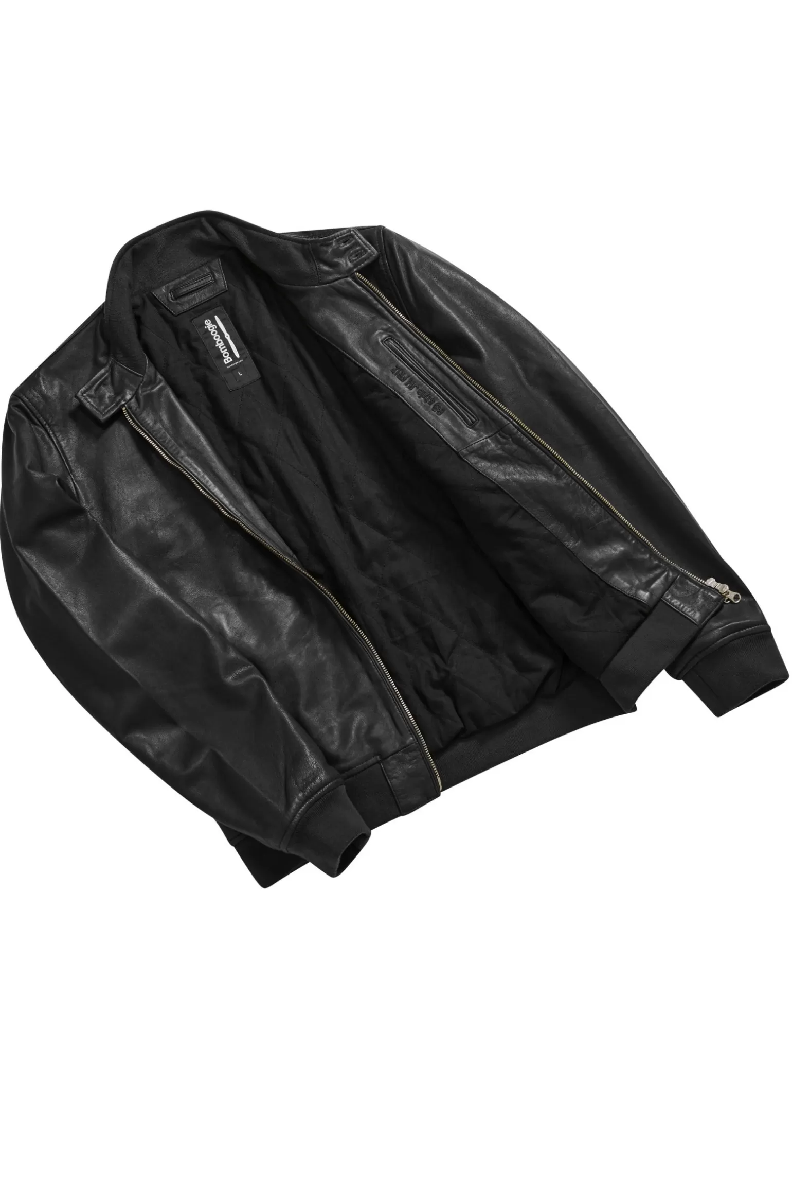 Leather jacket with high collar closed with a double button, finished with elastic bands on the bottom hem and cuffs.