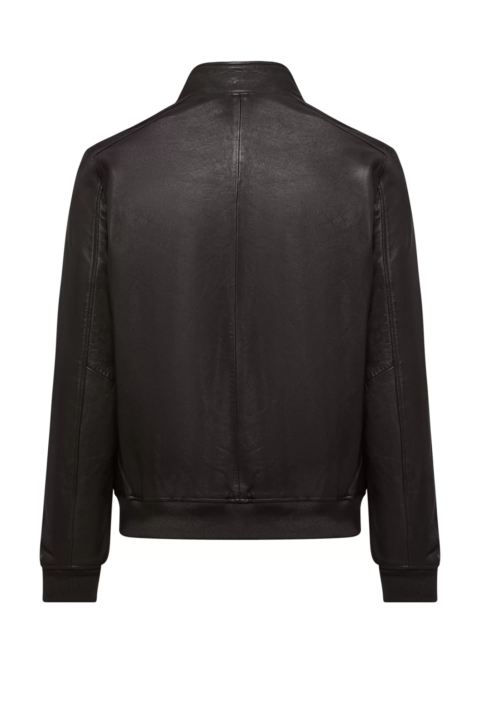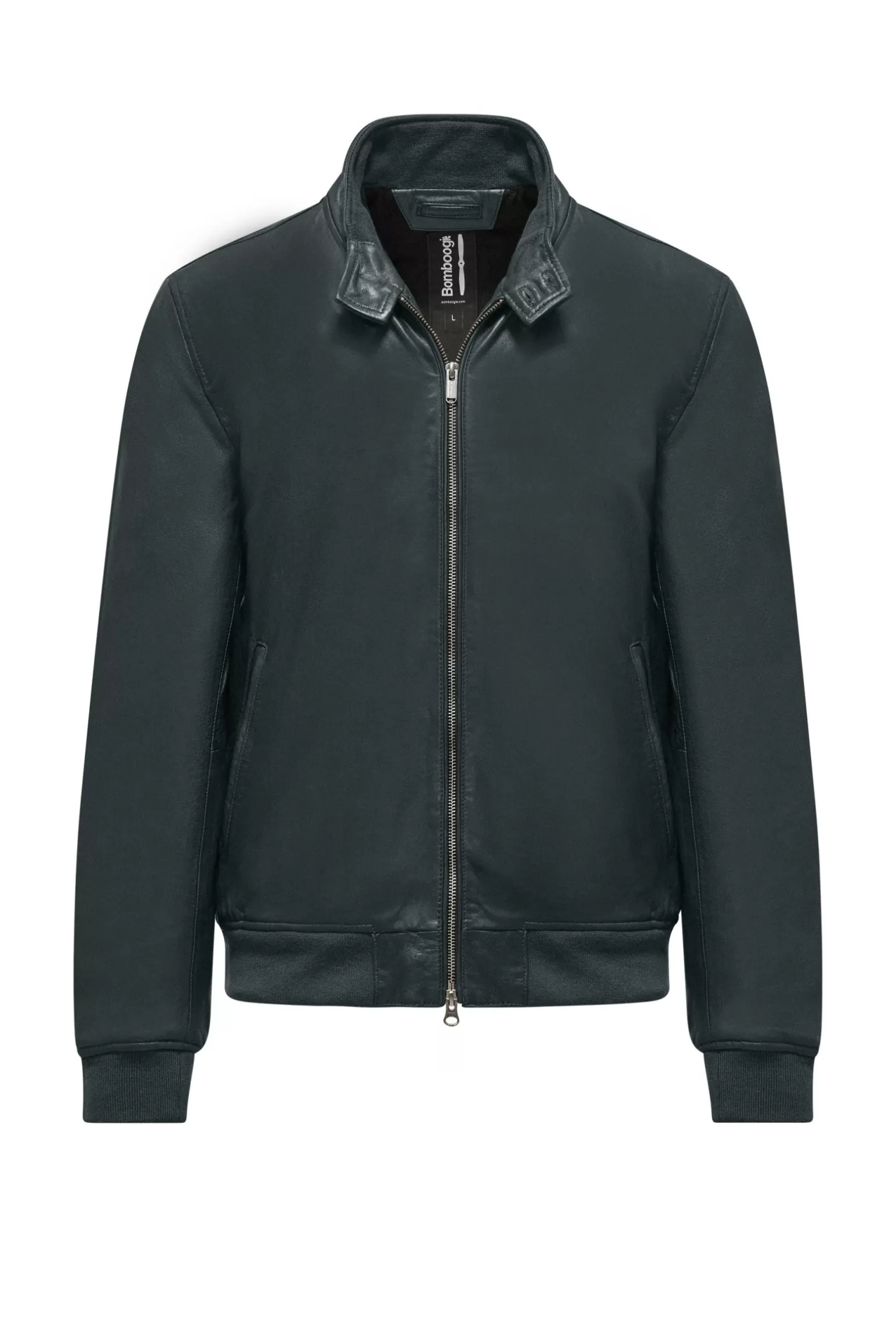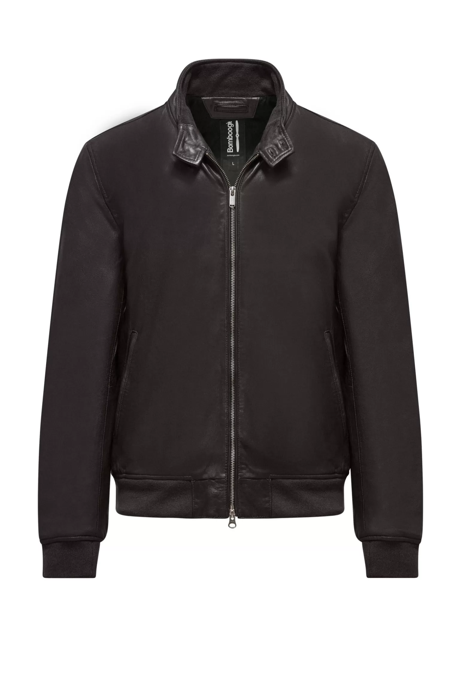 Leather jacket with high collar closed with a double button, finished with elastic bands on the bottom hem and cuffs.