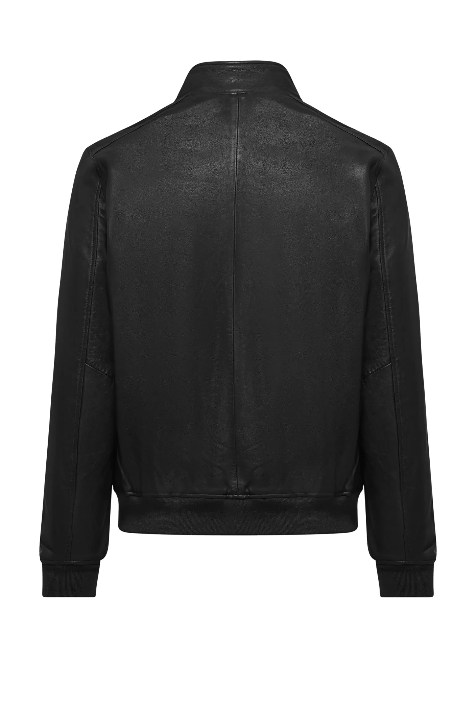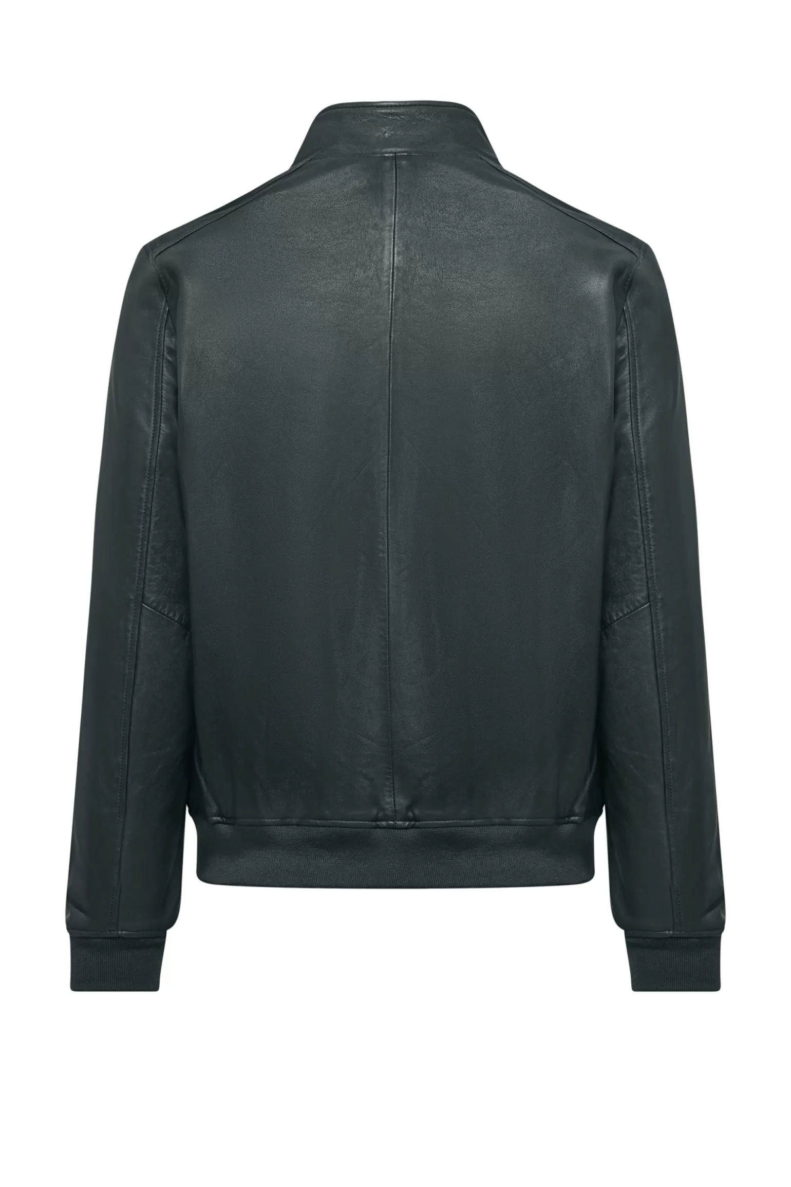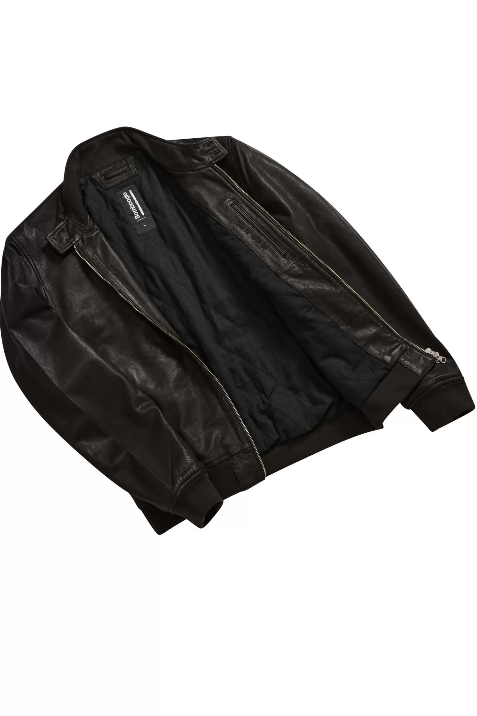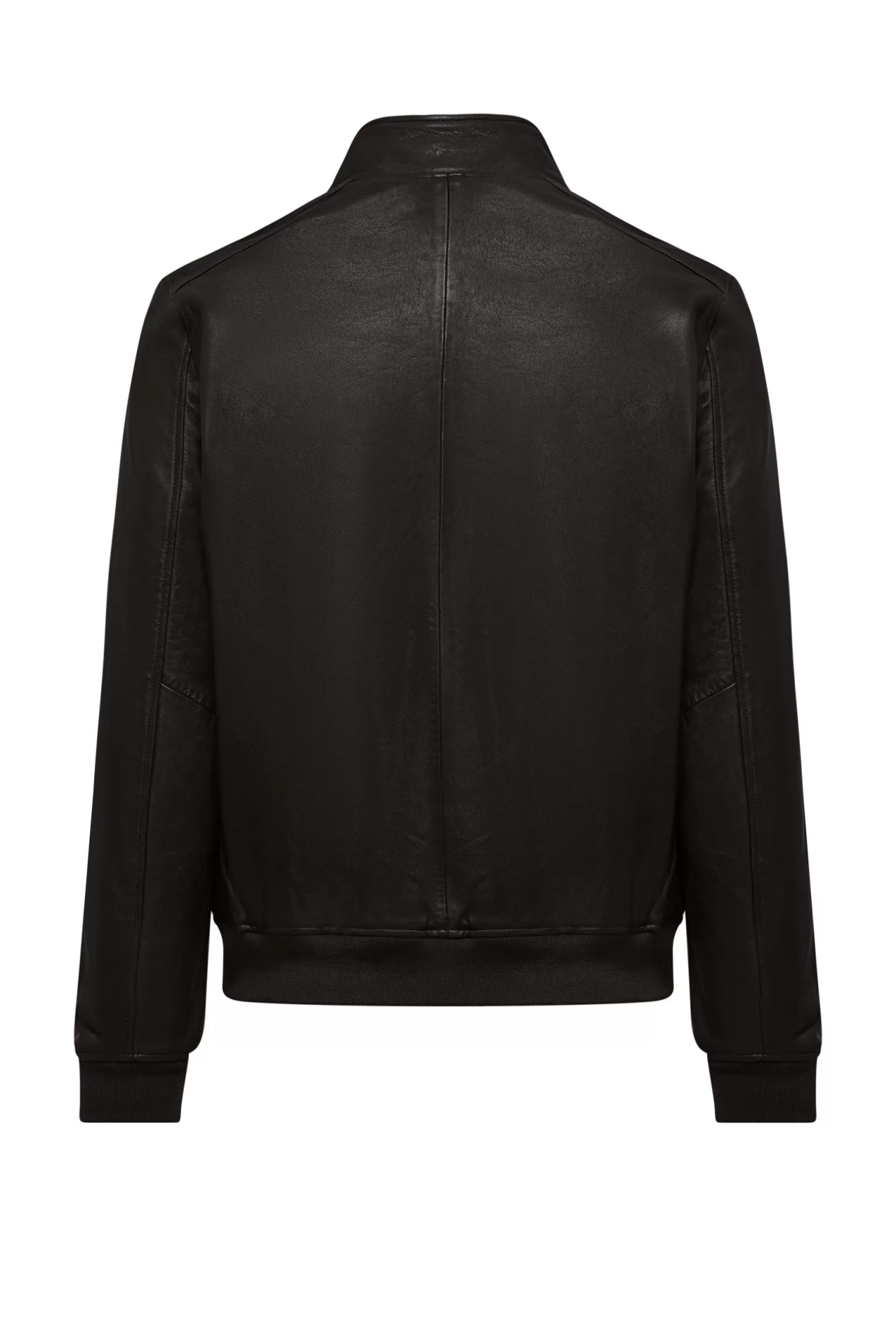 Leather jacket with high collar closed with a double button, finished with elastic bands on the bottom hem and cuffs.