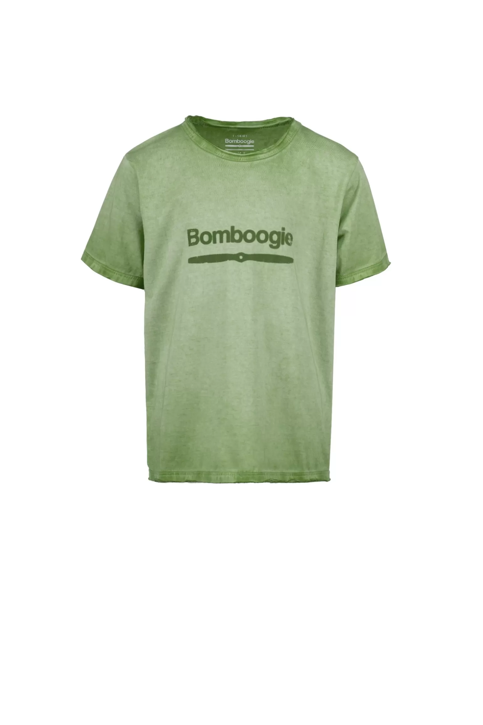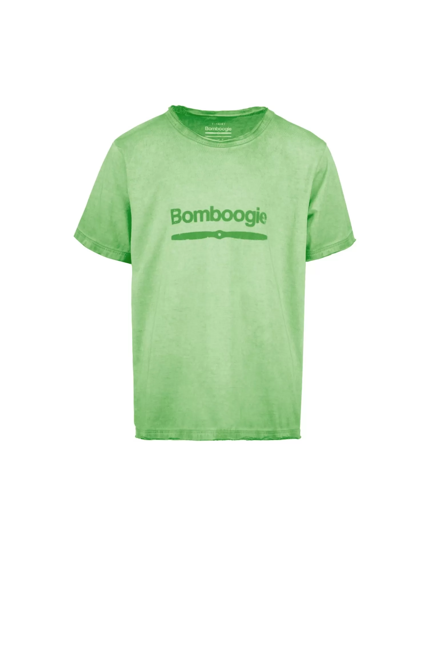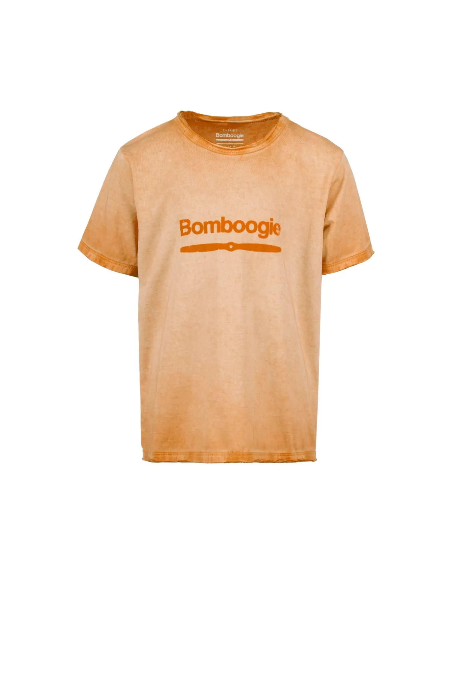- Crew-neck model with Bomboogie logo on the front and short sleeves, with raw cut edging on the collar, hem and cuffs.